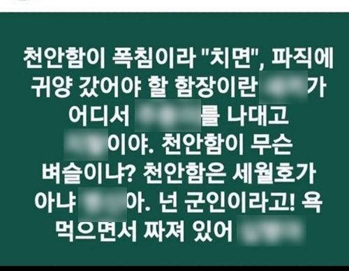 A 씨는 자신의 SNS에 최 전 함장을 향해 "천안함이 폭침이라 '치면' 파직에 귀양을 갔어야 할 함장이란 XX"라는 욕설과 함께 "천안함이 무슨 벼슬이냐"라는 글을 올렸습니다.