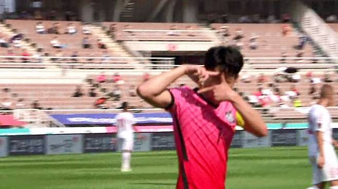 특유의 카메라 세리머니로 A매치 27호 골을 자축했습니다.