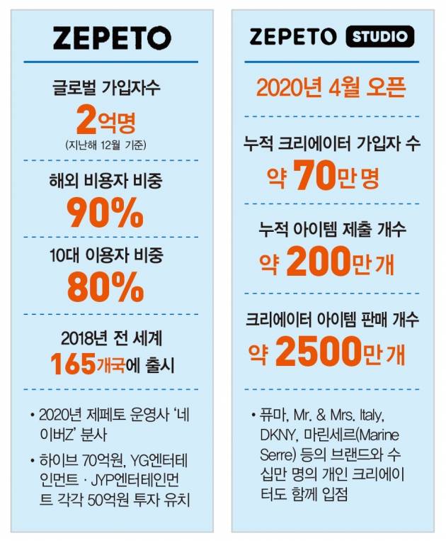 제페토가 전환점을 맞이한 것은 2020년이다. 그해 5월 제페토를 운영하는 네이버Z가 스노우에서 물적 분할로 분사했다. 그 후 제페토는 하이브(구 빅히트엔터테인먼트)에서 70억원, YG엔터테인먼트와 JYP엔터테인먼트에서 각각 50억원씩을 투자받았다.