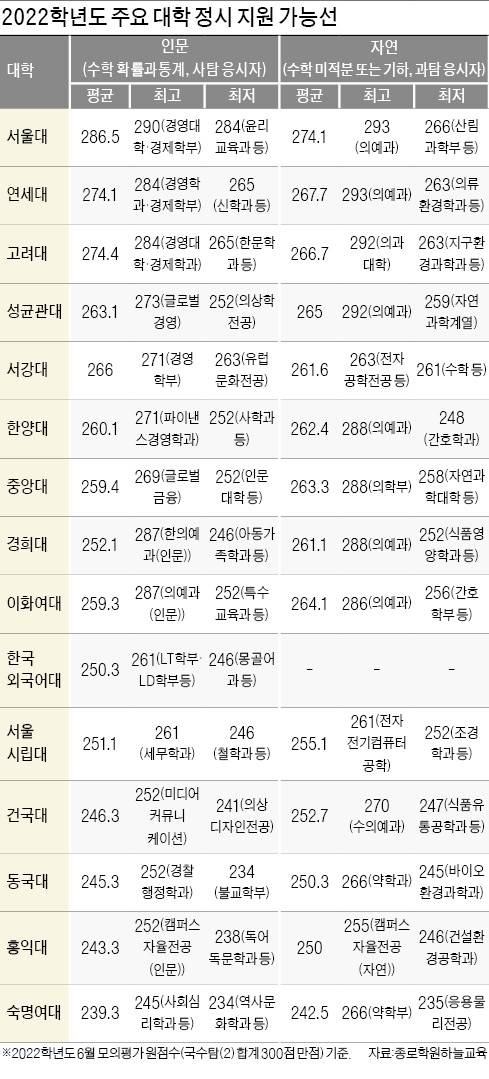 종로학원 분석 결과, 2022학년도 6월 모의평가 원점수(국수탐(2) 300점 만점) 기준으로 SKY(서울·연세·고려대)권 인문계열 학과 정시 지원 가능 점수(예상합격선)는 최고 290점에서 최저 265점으로 예상된다. 자연계열은 최고 293점에서 최저 263점의 분포를 보일 것으로 전망된다. 대학별로 살펴보면, 서울대 인문 정시 지원 가능 점수는 290점(경영대학, 경제학부)에서 284점(윤리교육과 등)으로 분석된다. 서울대 자연계열은 293점(의예과)에서 266점(산림과학부 등)으로 추정된다. 연세대 인문은 284점(경영학과, 경제학부)에서 265점(신학과 등), 자연은 293점(의예과)에서 263점(의류환경학과 등)의 분포를 보일 것으로 예상된다. 고려대 인문은 284점(경영대학, 경제학과)에서 265점(한문학과 등)으로 예상되며, 자연은 292점(의과대학)에서 263점(지구환경과학과 등)으로 추정된다.