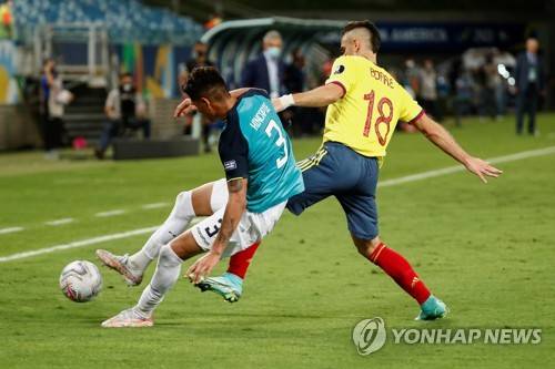 epa09269321 Colombia's Rafael Santos Borre (R) in action against Ecuador's Piero Hincapie, during the Copa America group A preliminary round soccer match between Colombia and Ecuador at Arena Pantanal stadium in Cuiaba, Brazil, 13 June 2021. EPA/Sebastiao Moreira