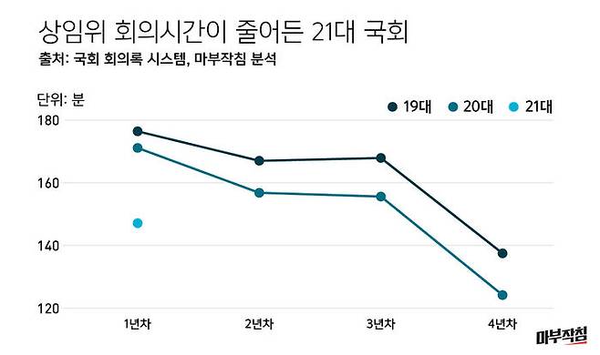 21대 상임위원회 평균 회의 시간은 19대와 20대의 3년 차 이후 수치와 비슷한 수준이다. 19대와 20대 국회에 견주어보면 개의 1년 차는 그래도 회의시간이 다른 때보다 길었던 시점인데, 지난 국회와 흐름이 같다면 21대 상임위원회의 회의 시간은 앞으로 더 떨어질 가능성이 있다.