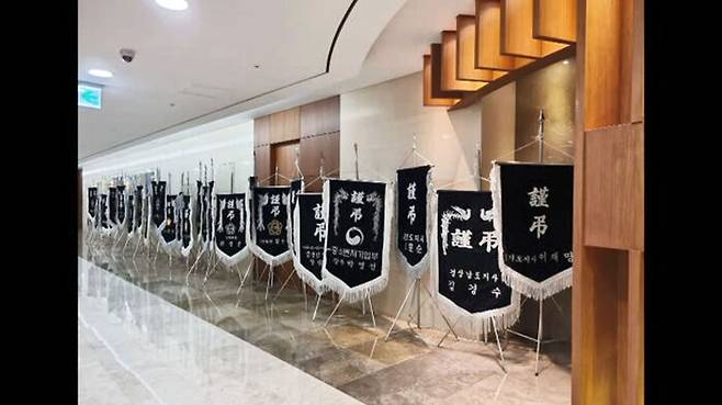 방송인 김어준 씨 부친의 빈소 앞. 조기가 길게 늘어서 있습니다.
