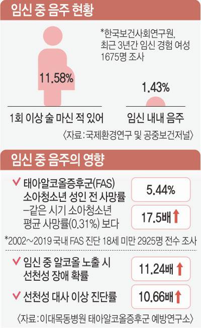 이처럼 임신 중 음주의 해악이 매우 큼에도 우리나라 임신부 10명 가운데 1명 이상은 임신 상태에서 1회 이상 음주 경험이 있는 것으로 조사됐다. 태아알코올증후군 예방연구소가 지난 4월 ‘국제환경 연구 및 공중보건저널’에 발표한 연구논문에 따르면 최근 3년간 임신 경험 있는 여성 1675명을 분석한 결과 11.58%가 임신 중 1회 이상 술을 마셨고 이 중 1.43%는 임신 기간 내내 음주를 했다고 답했다.