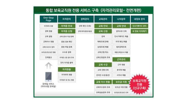 개편된 홈페이지에는 교육 교직원 자격증 신청과 발급, 교육 신청 등의 기존 서비스와 인사기록카드 관리, 근무경력·교육이수·자격 정보 관리, 근무상황 및 휴직·면직 신청, 온라인 구인·구직, 보육 교직원 급여 조회, 급여 모의계산 기능 등이 추가됐습니다.