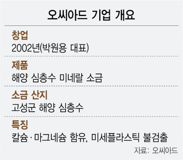 2002년 창업한 오씨아드는 강원도 고성의 해양심층수에서 소금을 만든다. 연안에서 6km 떨어진 곳의 수심 605m의 심층수를 취수해 초정밀 마이크로 필터로 거른 후 한국해양과학기술원과 함께 개발한 '순간공중결정제염기술'을 적용한다. 이 기술은 해양심층수를 미세한 안개상태로 쪼개 공기 중에 분사하고 여기에 열풍을 불어 넣어 수분을 순간적으로 증발킨다. 해양 심층수의 수분을 제외한 모든 미네랄을 소금에 포함시켜 눈처럼 아래로 떨어뜨려서 소금을 제조하는 기술이다. 이후 채취한 소금을 건조, 입자 조절 후 해양 미네랄 100% 소금을 최종 생산한다. 창업 후 이 기술개발에 집중해 제품이 나오기까지 거의 20년이 걸렸다.