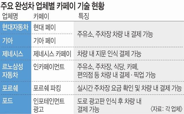 글로벌 완성차 업계의 ‘차량 내 간편결제 시스템(ICPS·In Car Payment System)’ 도입 경쟁이 치열하다. 주유소나 주차장 요금을 차 안에서 결제하던 기존 ‘카페이’는 점점 더 서비스를 확장해 편의점, 카페에도 손을 뻗는다.