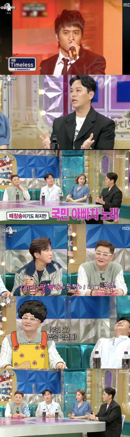 또한 아빠가 된 후 눈물이 많아졌다는 정재용은 아내가 자신만 봐면 '울어?'라고 한다고 고충을 토로했다. 이어 신지와의 무대를 꾸민 정재용. 세월을 이기지 못한 듯 지친 모습을 보였다. 이에 모두 “정재용씨 울어요? 오빠 울어?”라고 물었고, 정재용은 “오랜만에 멤버없이 무대 하니까 (멤버들이 생각난다)”고 말해 웃음을 안겼다.