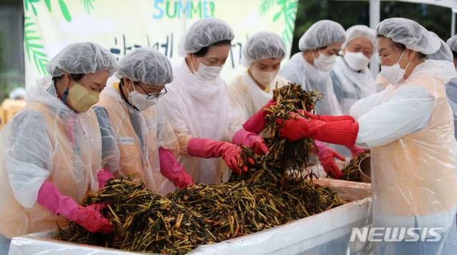 [서울=뉴시스]김선웅 기자 = 17일 오전 서울 노원구 대한적십자사 서울특별시지사 북부봉사관에서 열린 김장나눔 봉사활동 행사에서 봉사자들이 김장을 하고 있다. 이날 만들어진 김장김치 2000kg은 적십자 결연 아동, 청소년 한부모 가정 500세대 및 아동 시설에 전달될 예정이다. 2021.06.17. mangusat@newsis.com