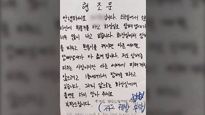 또 부산의 한 아파트에서는 화장실 내 흡연을 삼가달라는 입주민을 향한 반박문이 논란이 되고 있습니다.