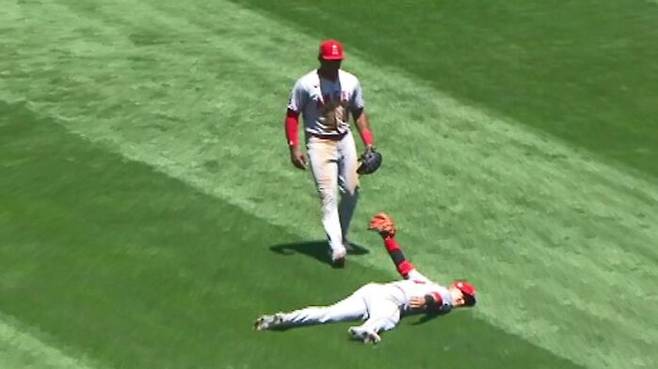 메이저리그 LA 에인절스 이글레시아스가 강렬한 태양에 맞선 연이은 호수비를 펼쳐 탄성을 자아냈습니다.