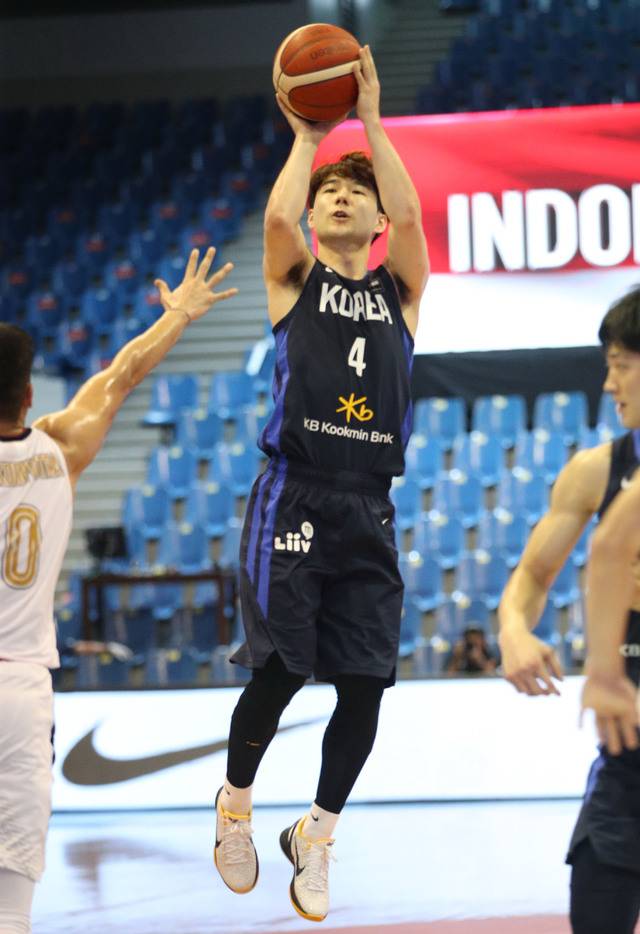 [서울=뉴시스]홍효식 기자 = 17일 오후 필리핀 앙헬레스에서 열린 2021 FIBA 아시아컵 예선 대한민국 대 인도네시아의 경기, 김낙현이 슛 하고 있다. (사진=대한민국농구협회 제공) 2021.06.17. photo@newsis.com *재판매 및 DB 금지