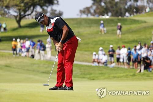 epa09281524 Hideki Matsuyama of Japan putts on the fifth hole during the first round of the 2021 US Open golf tournament on the South Course of the Torrey Pines Golf Course in San Diego, California, USA, 17 June 2021. EPA/ERIK S. LESSER
