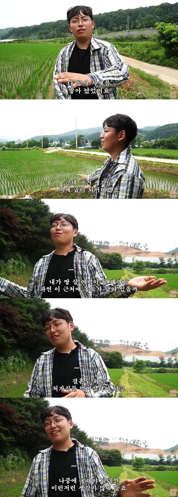 이날 한태웅은 직접 농사를 짓고 있는 논들을 살펴보며 뿌듯함을 드러냈다. 한태웅은 "'인간극장' 할 때는 농사짓던 논이 이거 하나밖에 없었다. 집 앞에 논도 골프장 공사한다고 다 공사 자재를 쌓아놨었다"라고 말했다.