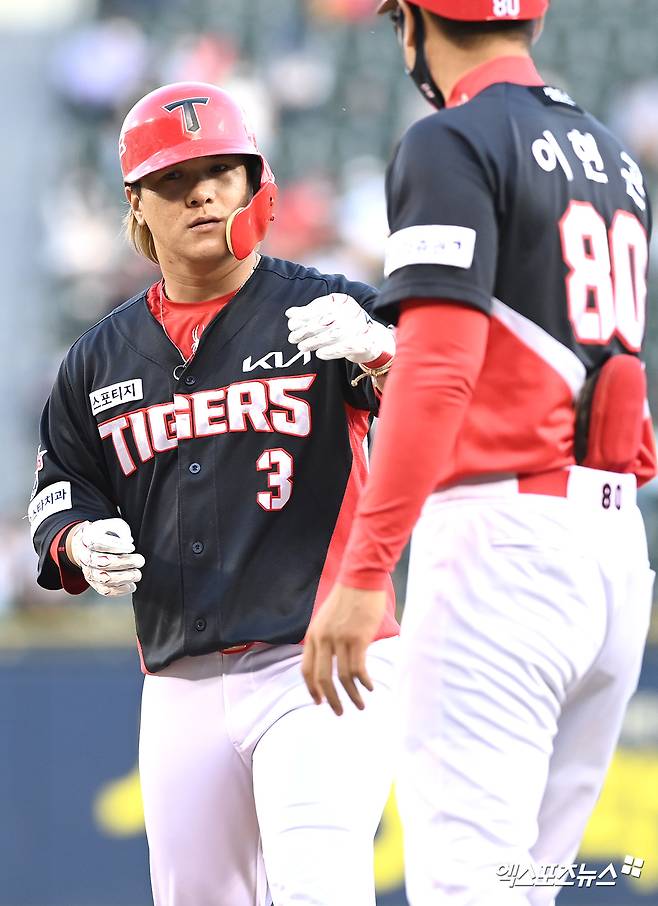 [엑스포츠뉴스 잠실, 고아라 기자] 19일 오후 서울 송파구 잠실야구장에서 열린 '2021 신한은행 SOL KBO리그' KIA 타이거즈와 LG 트윈스의 경기, 7회초 1사 KIA 김선빈이 1루타를 날리고 세리머니를 하고 있다.