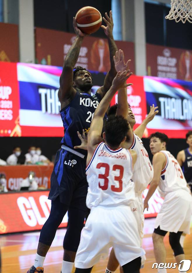 (서울=뉴스1) = 19일(현지시간) 필리핀 버블에서 열린 2021 국제농구연맹(FIBA) 아시아컵 예선 대한민국과 필리핀의 경기에서 라건아가 슛을 하고 있다. (대한민국농구협회 제공) 2021.6.19/뉴스1