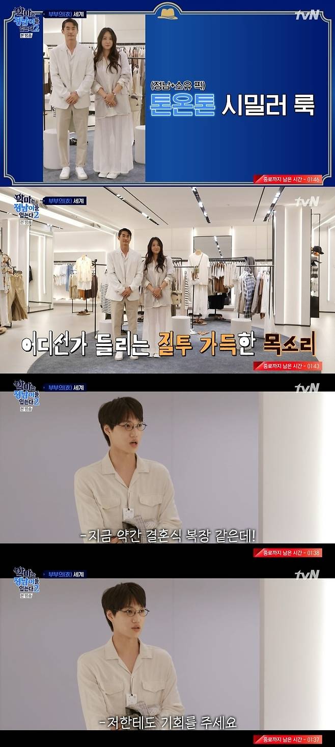 소유는 먼저 옷을 입고 나타난 배정남과 톤온톤 시밀러 룩을 보여줬다.