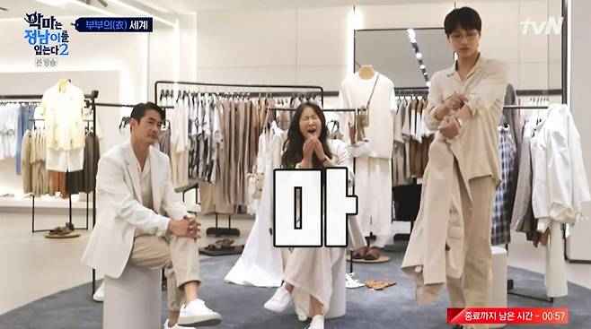 카이는 본인이 골라온 옷에 대해 "배정남과 바지는 똑같다. 근데 난 상의를 리넨 비스코스 혼방 소재로 준비했다"고 설명했다. 나영석 PD는 "마 같은 거냐"고 물었고 소유는 "리넨이다. 마 너무 오랜만에 듣는다"며 웃었다. (사진=tvN '악마는 정남이를 입는다 2' 캡처)