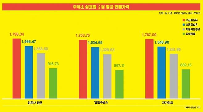 한국석유공사 유가정보사이트 오피넷에 따르면 6월7일 기준 정유 4사가 운영하는 일반 주유소의 기름값은 ℓ당 평균 ▲고급 휘발유 1798.34원 ▲보통 휘발유 1566.47원 ▲자동차용 경유 1363.50원이다. 같은 날 기준 알뜰주유소 기름값은 ▲고급 휘발유 1753.75원 ▲보통 휘발유 1534.65원 ▲자동차용 경유 1329.63원이다.