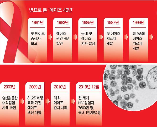1980년대 에이즈는 사형선고와도 같은 병이었다. 초창기 환자의 80% 이상이 목숨을 잃었다. 에이즈를 유발하는 인체면역결핍바이러스(HIV)는 성관계, 수혈로 몸속에 들어와 면역세포를 파괴시키는 바이러스다. HIV에 감염되더라도 증세를 느끼지 못하고 감염 사실을 모른 채 살아가다 감염 등 합병증과 함께 갑자기 발병한다. 세계보건기구(WHO)에 따르면 첫 환자 보고 이후 마지막 공식 통계가 나온 2019년 12월까지 전 세계 감염자는 7600만 명, 사망자는 3300만 명에 이른다.