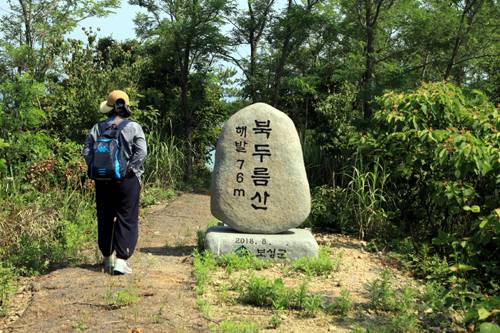 가고 싶은 섬 가꾸기 사업으로 조성된 하방금 근처 탐방로를 따라 이 섬의 최고봉 북두룸산으로 발길을 옮겼다. 완만한 경사에 야자매트가 깔려 있어 산행하는데 불편함이 없었다. 이미 많은 산악동호회에서 자신들이 먼저 이곳을 다녀갔다며 곳곳에 띠지에 흔적을 남겼다. 보랏빛 수국과 노란 금계국이 탐방로를 수놓고 있었다. 정상에 다다를 즈음 노루가 목격되기도 했다. 왜 이곳이 장도인지를 말하려고 나타난 것일까. 등과 이마에서 땀이 축축이 젖었다 싶을 때 76m 북두룸산 정상에 도착했다. 등산이라고 하기에 다소 민망한 곳을 정복하고 정상 아래 전망대로 향했다.