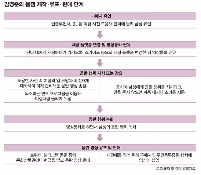그들의 말과 경찰 수사를 종합하면, 김영준은 익명 랜덤채팅 앱과 스카이프, 트위터 등을 범죄 통로로 이용해 왔다. 최근에는 세계 최대 데이팅 앱 '틴더'를 사용해 왔다. 틴더는 이용자들끼리 서로 '좋아요'를 누르면 앱 내에서 채팅을 할 수 있는 방식으로 구성돼 있다. 가입을 위해 별도로 신원을 밝힐 필요 없이 전화번호만 인증하면 된다.