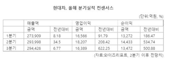 현대차의 실적 컨센서스는 꾸준히 높아지고 있다. 매출의 경우 3개월 전에는 29조124억원이 전망됐다가 1개월 기준 29조2407억원, 1주 전 기준으로는 29조3484억원으로 계속 늘었다. 영업이익 역시 3개월 전 1조7639억원에서 1개월 전 기준 1조8078억, 1주전 기준 1조8031억원으로 상승세가 이어지고 있다.