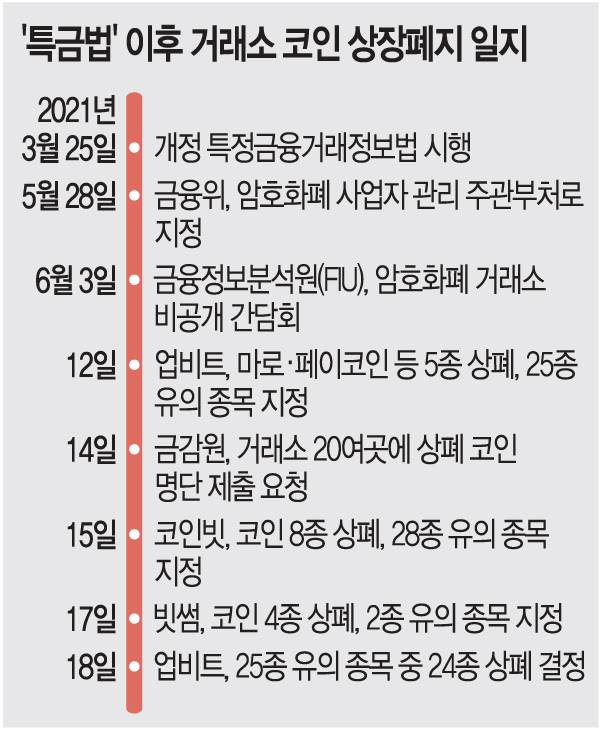 암호화폐 상장 절차는 코인 발행처가 제출하는 ‘프로젝트 백서(사업 계획서)’를 거래소가 자체 검토하는 게 전부다. 거래소가 코인을 상장시킬 때는 수수료 수익 등을 위해 다소 허술한 기준을 적용했다가, 지난 3월 개정 특정금융거래정보법(특금법) 시행 이후 금융 당국이 규제에 들어가자 뒤늦게 불량 코인 솎아내기에 나선 결과라는 해석이 나온다.