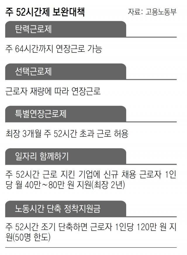 최근 경영계에서는 이에 대한 우려의 목소리가 적지 않다. 영세 기업들이 지난해 신종 코로나바이러스 감염증(코로나19) 확산에 따라 예정된 근무체계 개편에 대비하지 못했기 때문이다. 고용노동부는 주 52시간 근무를 지키기 어려울 경우 유연근무제 등 다양한 보완 대책을 활용할 수 있다고 설명했다. 근로시간 단축 기업에 각종 지원을 제공한다는 방침도 밝혔다. 소규모 기업을 위한 주 52시간 보완 대책을 문답(Q&A)으로 알아봤다.