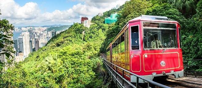 홍콩을 360도 파노라마로 한눈에 담을 수 있는 빅토리아 피크는 '세계에서 가장 아름다운 야경 명소'라 불리는데요, 정상에 오를 때는 대부분 45도가 넘는 급경사로를 오르내리는 피크 트램을 이용합니다.