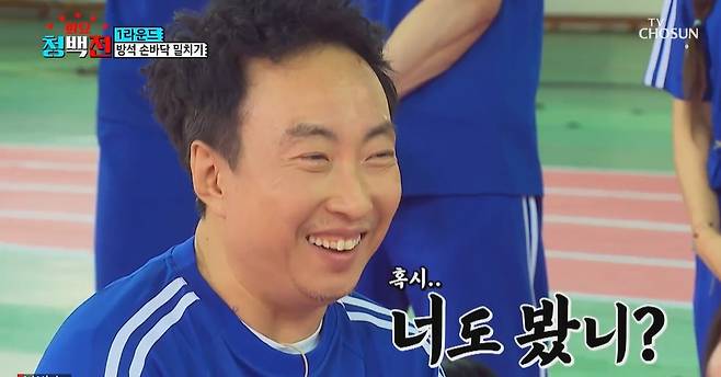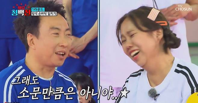22일 방송된 TV조선 '화요청백전'에선 1라운드에서 청팀 박명수와 백팀 홍현희가 방석 손바닥 밀치기 게임 대결을 펼쳤다.