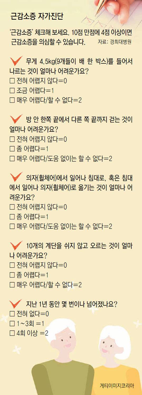 근감소증(사코페니아)는 이런 노년기에 겪을 수 있는 대표적 질환 중 하나다. 근감소증이 생기면 팔과 다리 등을 구성하는 골격근과 근력이 정상보다 크게 줄어든다. 별다른 질병이 없는데도 아침에 자리에서 일어나기가 힘들다. 힘이 없고 기력도 약해진다. 입맛이 없어 식사도 잘 하지 못한다. 특히 이유 없이 살이 빠지기 시작한다면 근감소증을 의심해봐야 한다. 또 걷는 속도가 급격히 느려졌거나 계단을 오르는 것은 물론이고 걷는 데에도 힘이 부친다면 병원을 찾아 상담을 받는 것이 좋다.