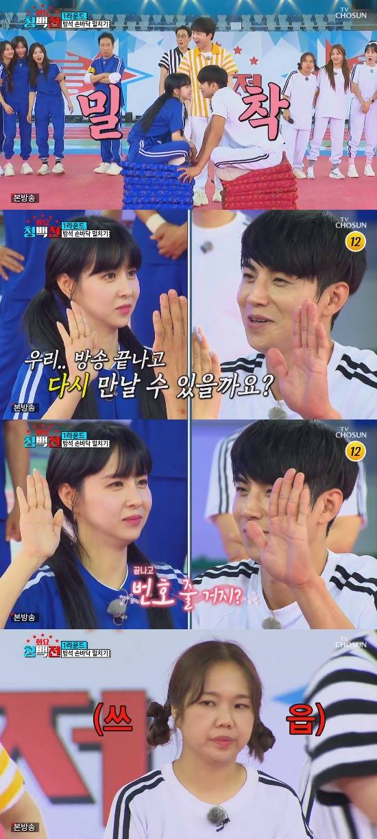 이날 청팀의 박명수와 백팀의 홍현희는 '방석 손바닥 밀치기' 게임으로 만났다. 높게 쌓인 방석에 앉아 서로에게 한마디씩 하면서 손바닥을 밀쳐 상대팀을 쓰러뜨리는 팀이 이기는 게임이었다.