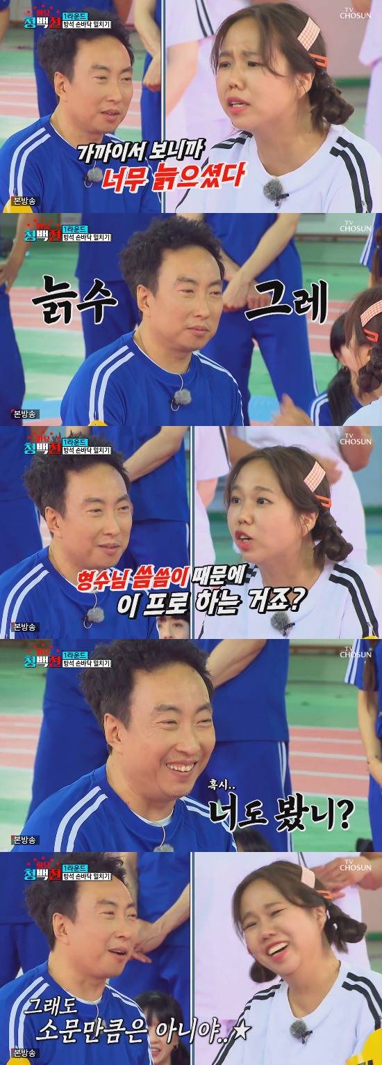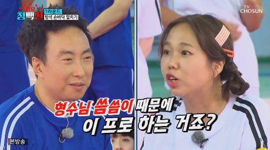 홍현희는 박명수를 보자마자 "가까이서 보니까 너무 늙으셨다" "수염이 하얗다" "선배님 쌍꺼풀 터졌다. 리터칭이 필요한 것 같다" 등의 공격으로 박명수를 할 말 없게 만들었다. 이어 홍현희는 박명수를 향해 "선배님, 원래는 이 프로그램 하고 싶지 않았는데 형수님 씀씀이 때문에 하시는거죠?"라는 돌직구 질문을 던졌다.