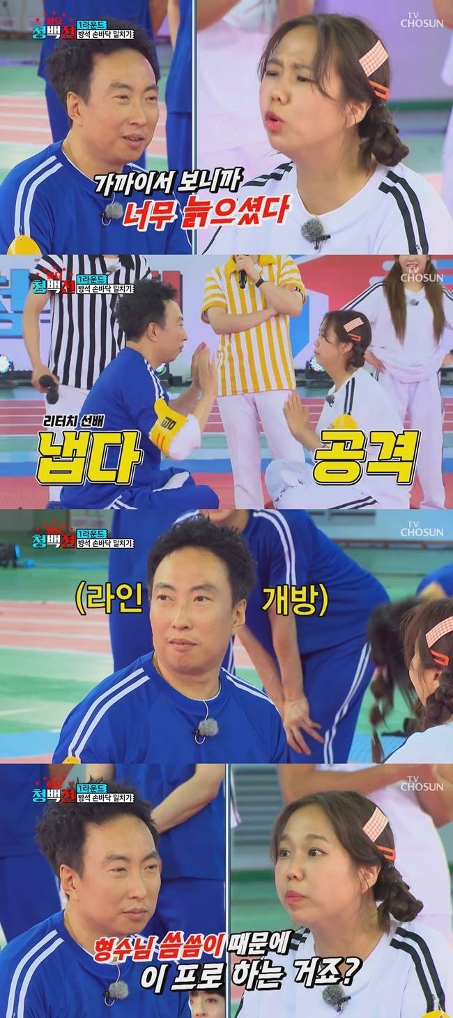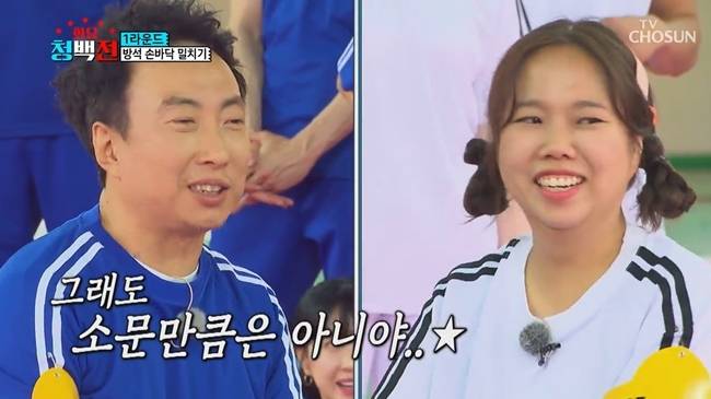 이날 방석에서 손바닥 밀치기 게임에선 청팀 박명수, 백팀 홍현희가 출전했다.