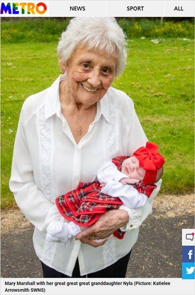 고손녀 토니-리 "내가 임신했다는 사실을 알았을 때 '기록 세우는 거 아니야?'라고 우리끼리 농담했는데, 실제로 찾아보니 스코틀랜드에는 6세대 대가족 사례가 없더라"라고 밝혔습니다.