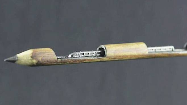 연필심 끝에 기타가 만들어지기도 하고 가로로 눕힌 연필에 긴 기차가 지나가는 모습이 그대로 담겼습니다.