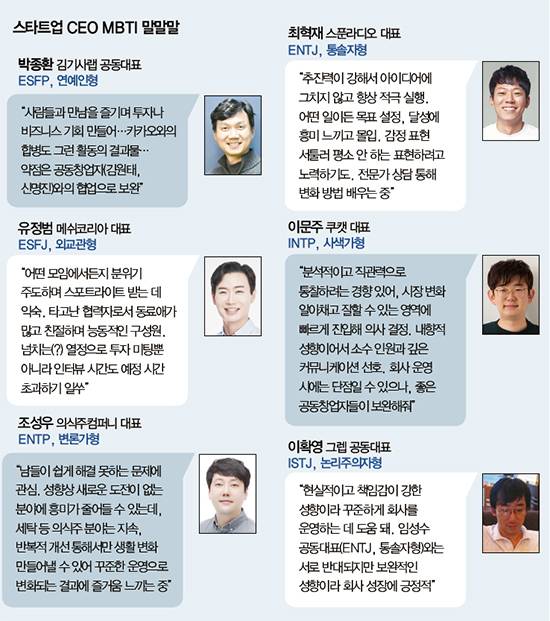 ESTJ는 강신봉 요기요 대표, 신명진 김기사랩 공동대표, 김병훈 에이피알(APR) 대표, 신혜성 와디즈 대표, 최혁재 스푼라디오 대표 등이, ISTJ는 김재현 당근마켓 대표, 이확영 그렙 공동대표, 김동환 백패커 대표 등이, ESFJ는 유정범 메쉬코리아 대표가 눈에 띈다.