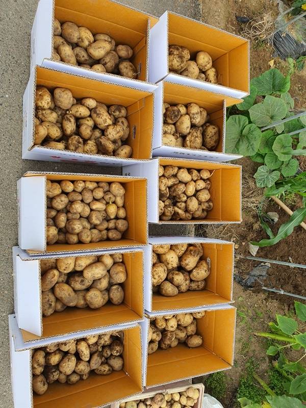 두 개의 두둑에서 감자 10상자를 채웠다. 어떤 것은 어른 손바닥보다 크고 어떤 것은 어린애기 주먹 만한 것에 이르기까지 다양했지만, 벌레 먹은 감자가 4~5알 정도 밖에 나오지 않았으니 감자 농사는 완전 대 성공한 것이다. 농산물 분류하는 것이 생각나서, 대중소로 나누어 상자에 담으니 대는 6상자, 중은 4상자였다. 현장에서 지인들에게 감자수확을 알리고 20여 분 만에 완판했다. "수미감자 나왔어요. 10kg 박스 당 15000원이에요".