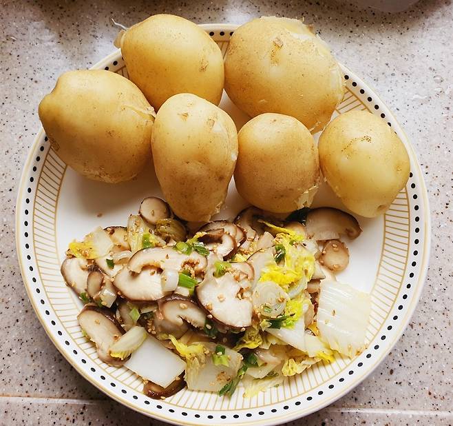 | ▲ 부부의 건강한 아침밥 수확한 감자을 삶고, 버섯과 배추로 볶음한 아침밥상 |