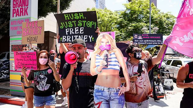 법원 밖에서는 스피어스의 팬 100여 명이 모여 '브리트니를 해방하라'(Free Britney)라고 외쳤습니다.