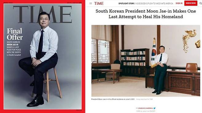 타임은 인터넷 홈페이지에 문 대통령과의 인터뷰 기사와 함께한 문 대통령의 모습이 담긴 7월판 표지 사진을 공개했습니다.
