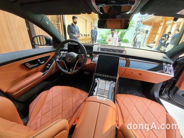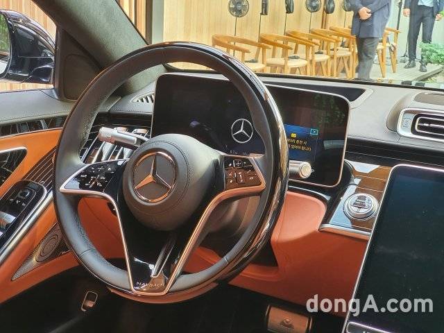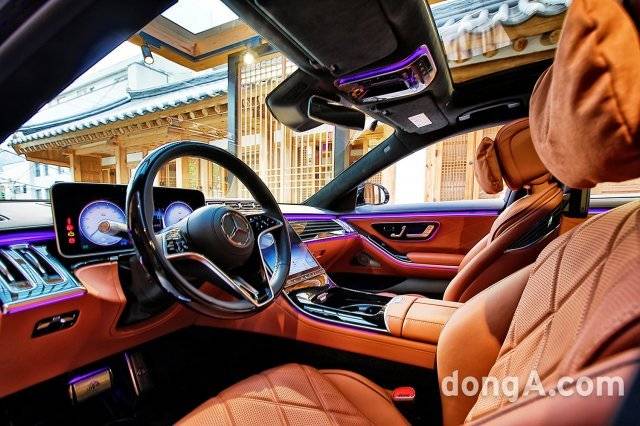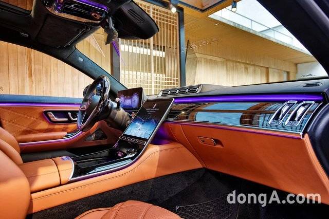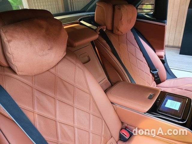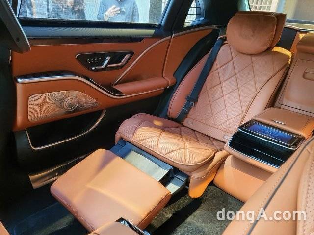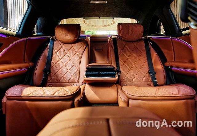 실내 앞좌석은 S클래스와 비슷한 구성이다. S클래스와 마찬가지로 디지털과 아날로그가 조화를 이루면서 고급스러운 느낌을 살렸다. 12.8인치 OLED 디스플레이와 3D 계기반 등 총 5개 디스플레이 스크린이 탑재됐다. 익스클루시브 패키지가 기본 적용된 시트는 정교한 다이아몬드 문양의 나파 가죽으로 마감됐고 루프라이너는 고품질 다이나미카 극세섬유로 이뤄졌다. 실내 무드등은 64가지 컬러를 지원하고 로즈골드화이트와 아메시스트 글로우 등 테마 컬러 적용도 가능하다.