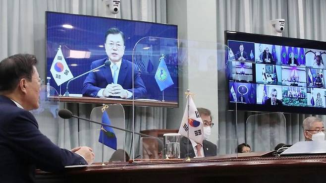 문재인 대통령은 오늘(25일) 오전 청와대 여민관에서 중미통합체제, SICA 회원국 8개 나라 정상 등과 화상 정상회의를 갖고 양측의 포괄적 협력관계를 발전시켜 나가기로 했습니다.