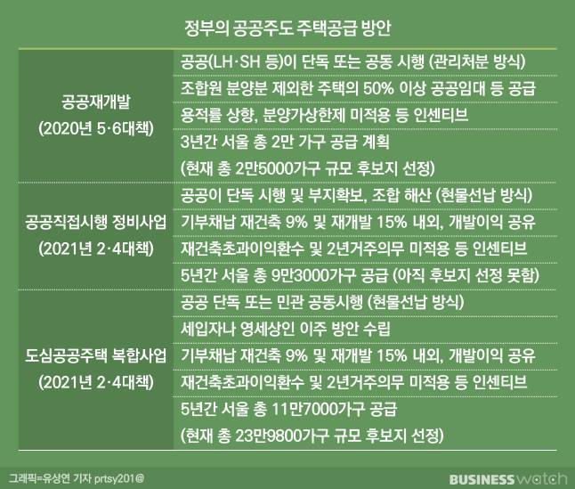 국토교통부는 지난해 5·6대책에서 공공재개발을, 올해 2·4대책에서 공공직접시행 정비사업과 도심공공주택복합사업 등을 도입하기로 했다.
