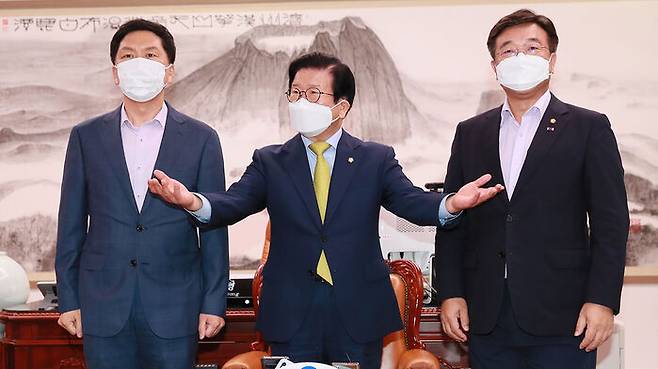윤호중 더불어민주당 원내대표와 김기현 국민의힘 원내대표는 오늘(28일) 오전 박병석 국회의장 주재로 열린 교섭단체 원내대표 회동에서 신경전을 이어갔습니다.