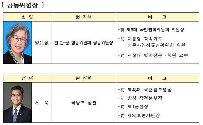 합동위원회는 박은정 전 국민권익위원회 위원장과 서욱 국방부 장관을 공동위원장으로 ▲ 1분과 장병 인권보호 및 조직문화 개선 ▲ 2분과 성폭력 예방 및 피해자 보호 개선 ▲ 3분과 장병 생활여건 개선 ▲ 4분과 군 사법제도 개선 등 4개 분과로 구성됐습니다.
