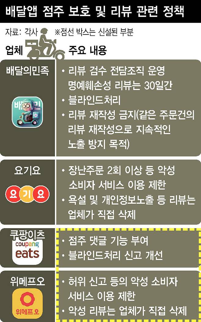 사업자의 예방·사후조처에 책임을 강화하는 분위기에 다른 배달앱들도 별점·리뷰 대책 개편을 고민 중이다. 업계 1위 배달의민족은 “악성리뷰 관련 사장님 피해를 최소화할 수 있도록 현재 정책 고도화를 위한 내부 논의를 진행중”이라고 밝혔다. 배민은 2019년 리뷰 검수 전담 조직을 신설해 모니터링을 강화하고, 명예훼손 여지가 있는 리뷰는 업주가 요구할 경우 30일간 임시조처로 노출되지 않도록 하는 수준으로 리뷰 대책을 운영 중이다. 요기요는 현재도 장난 주문 2회 이상, 반복·악의적으로 보상을 요청하는 소비자에 대해 서비스 이용을 제한 중이다. 요기요 관계자는 “이밖에도 추가 보호 대책이 필요할 경우 언제든 새로 시행할 수 있다”고 말했다.
