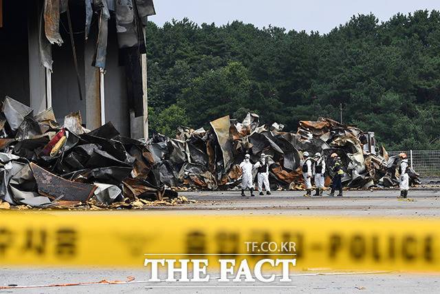 [더팩트ㅣ이천=남용희 기자] 경찰 및 소방, 국과수 등 유관기관 관계자들이 29일 오전 경기도 이천시 마장면 쿠팡 덕평물류센터 화재 현장에서 합동 감식을 위해 이동하고 있다.
