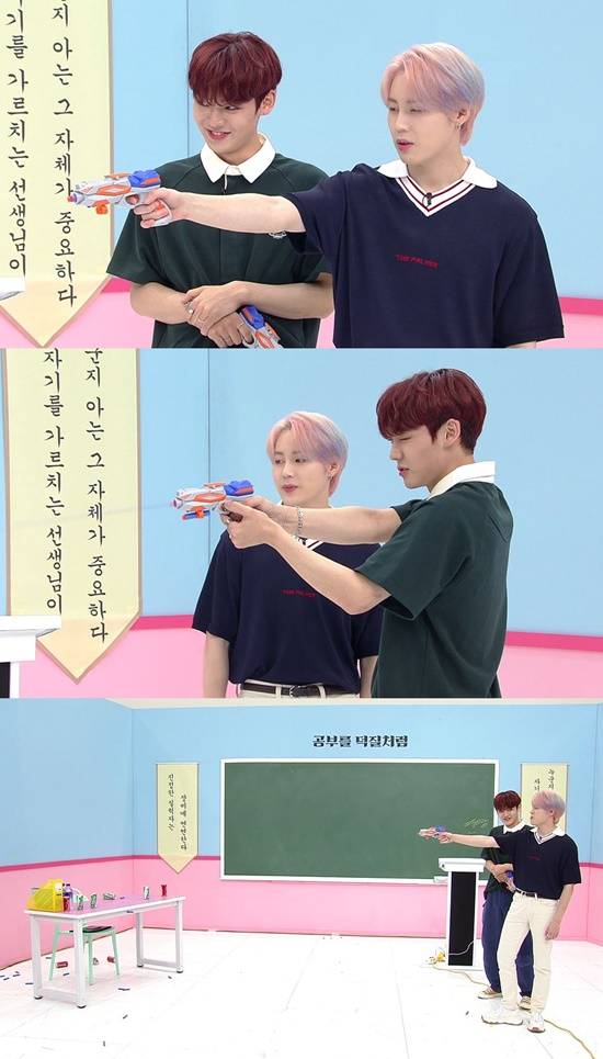 이후 어린이용 총을 들고 맞은 편에 음료 캔들을 진열해 사격 시범을 보인 하성운 쌤은 갑자기 영화 '아저씨' 속 원빈을 연기해 시선을 끈다.